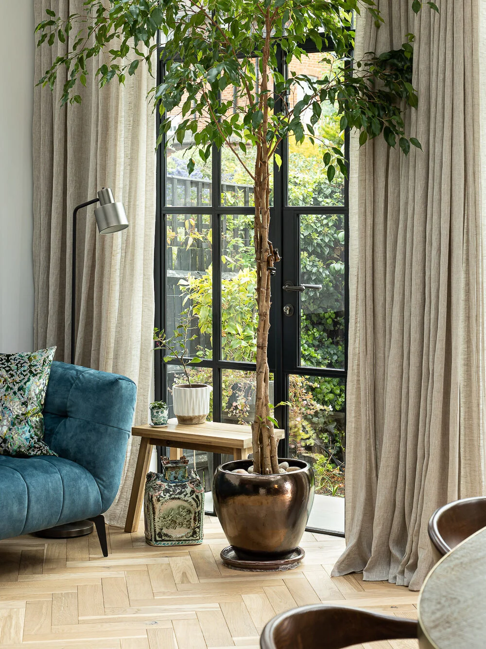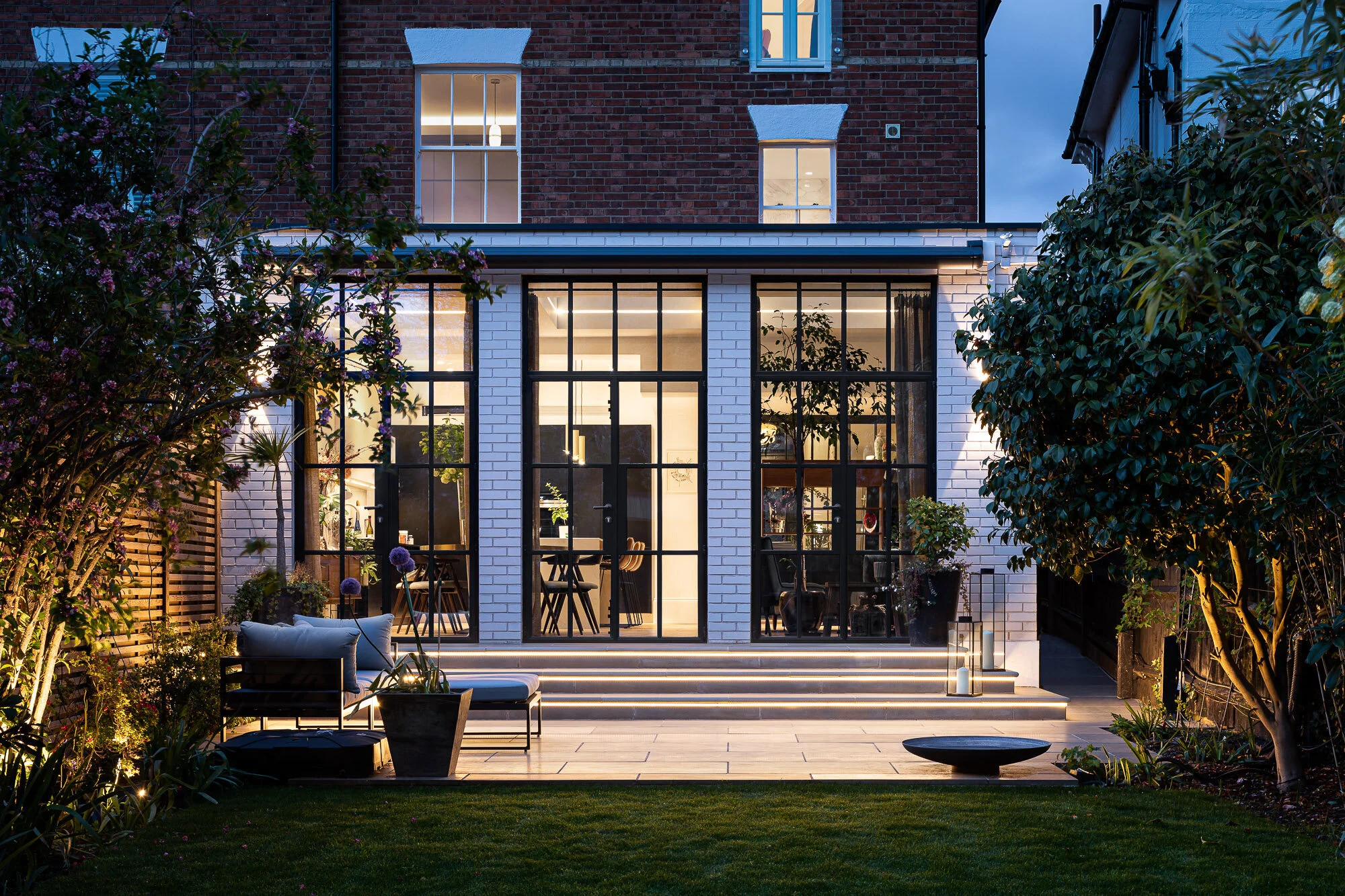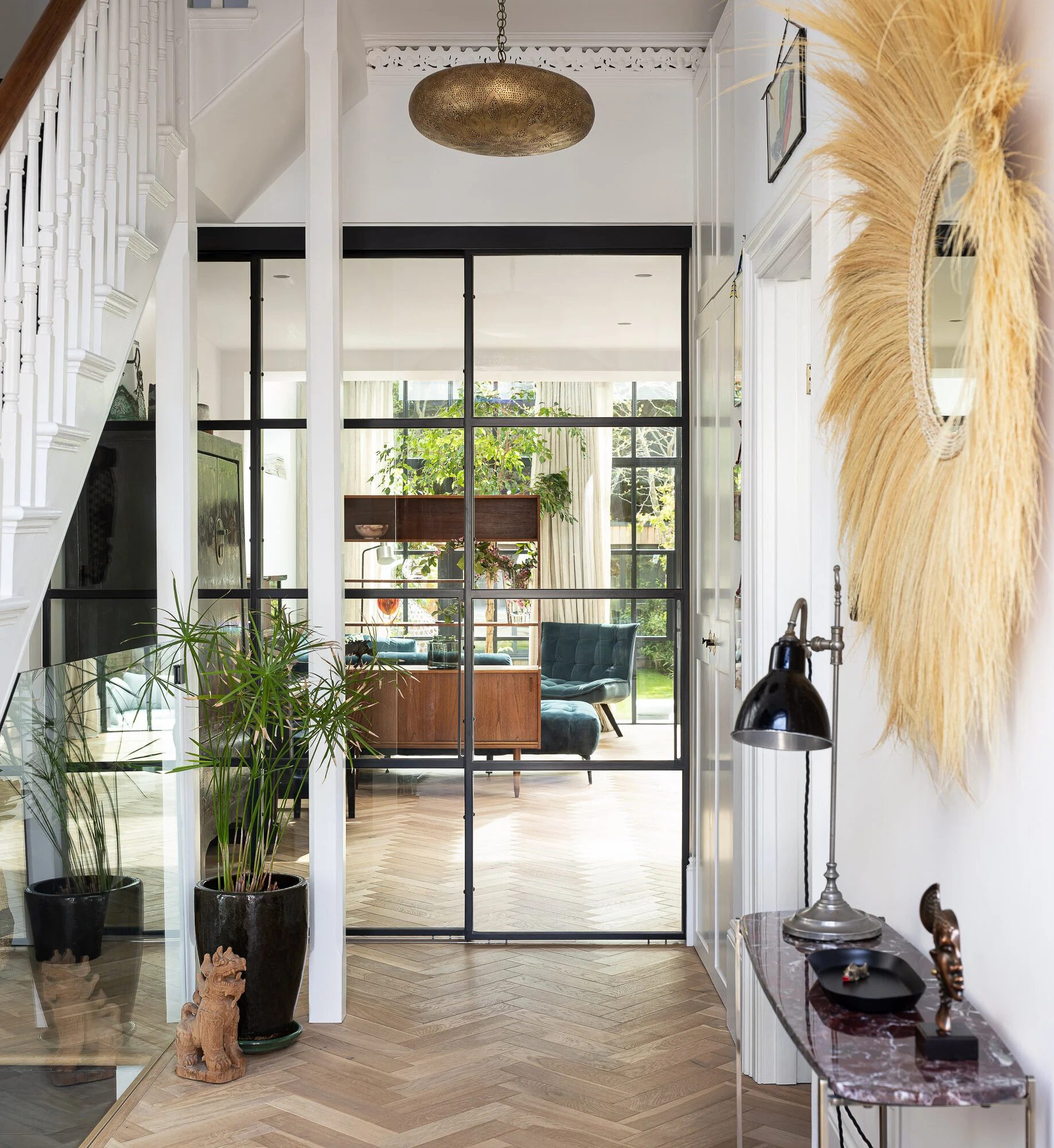 The architect wanted three floor-to-ceiling steel doors to create this bold classic and contemporary look. for For added luxury brass Frank Allart ironmongery was used throughout. The double sliding door to the kitchen are wonderful example of function and style in harmony.